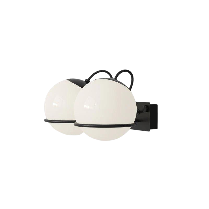 De to blæste opaline glaskugler holdes forsigtigt af to sorte stålringe. Stålringene har et lille snit, der gør det muligt at placere kuglerne nedad eller opad og dermed give en direkte eller indirekte lyssammensætning.