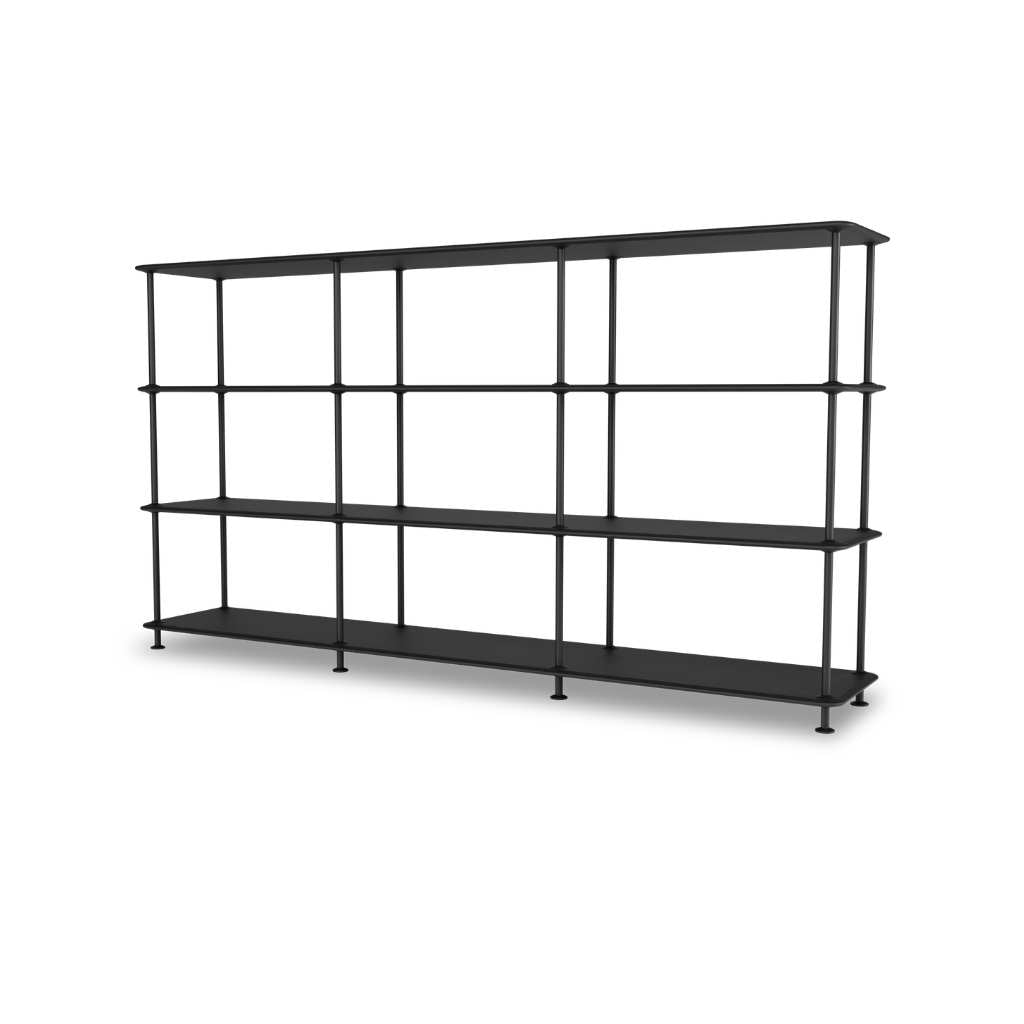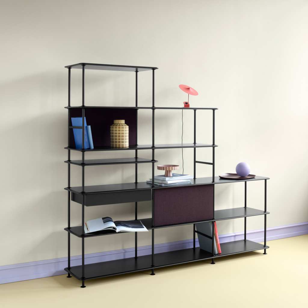 Reolen er fremstillet af 16 mm lakeret MDF med vertikale metalcylindre, hvilket giver både styrke og et let og minimalistisk udtryk.