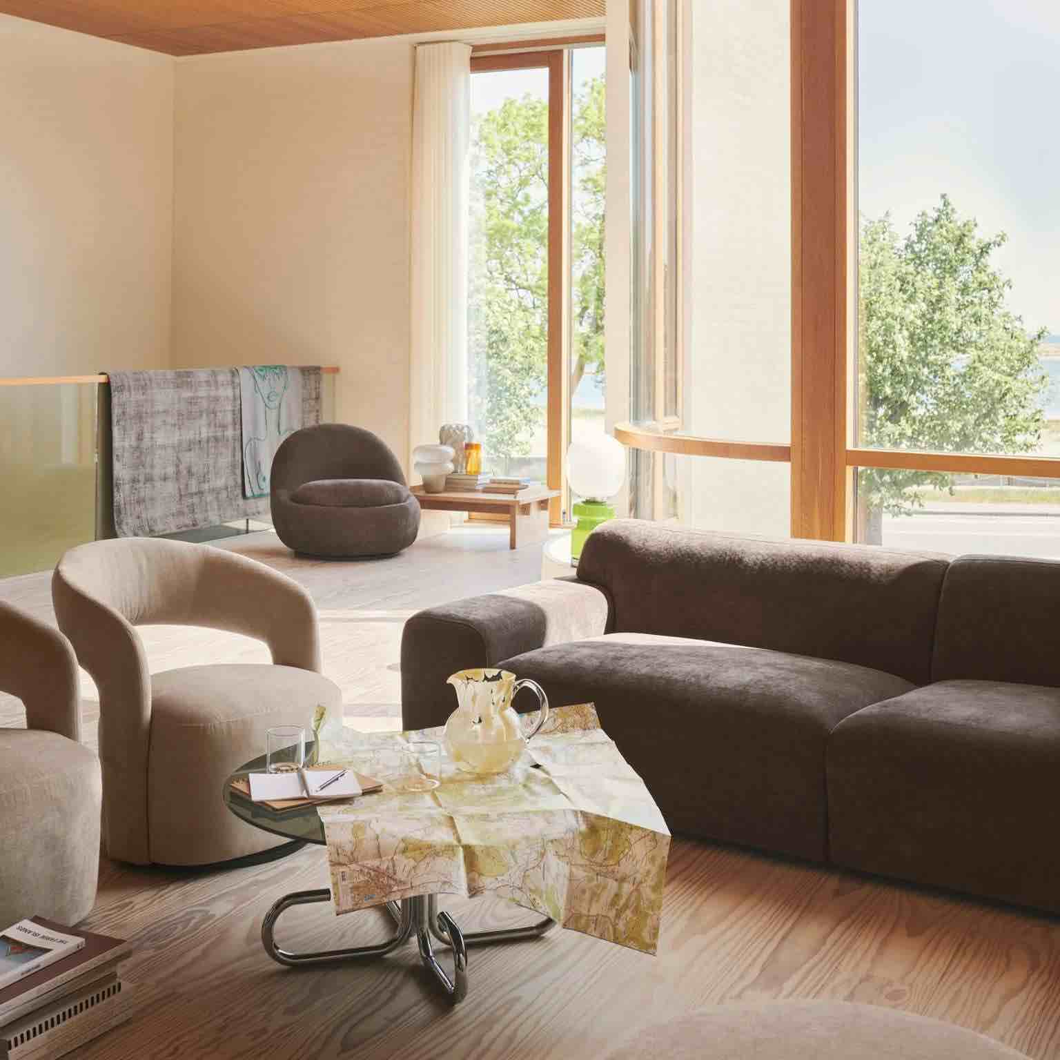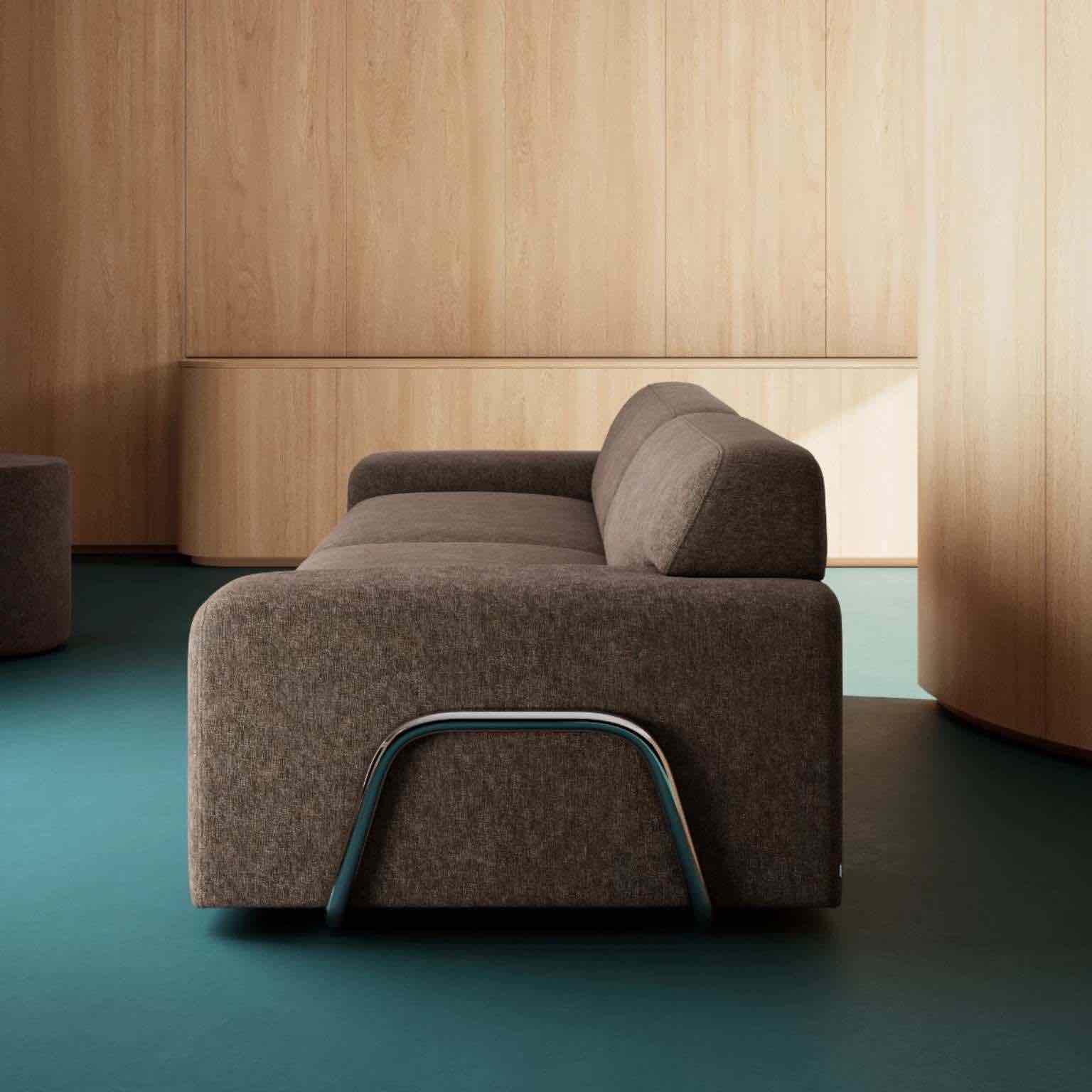 Gloria fra SOFACOMPANY har et industrielt og eksklusivt design, hvilket især kommer til udtryk i kontrasten mellem den bløde polstrede del og de forkromede geometriske bøjler i siderne. Loungefølelsen understreges af møblets lave og dybe proportioner, og i sin helhed udstråler Gloria masser af personlighed og statement.