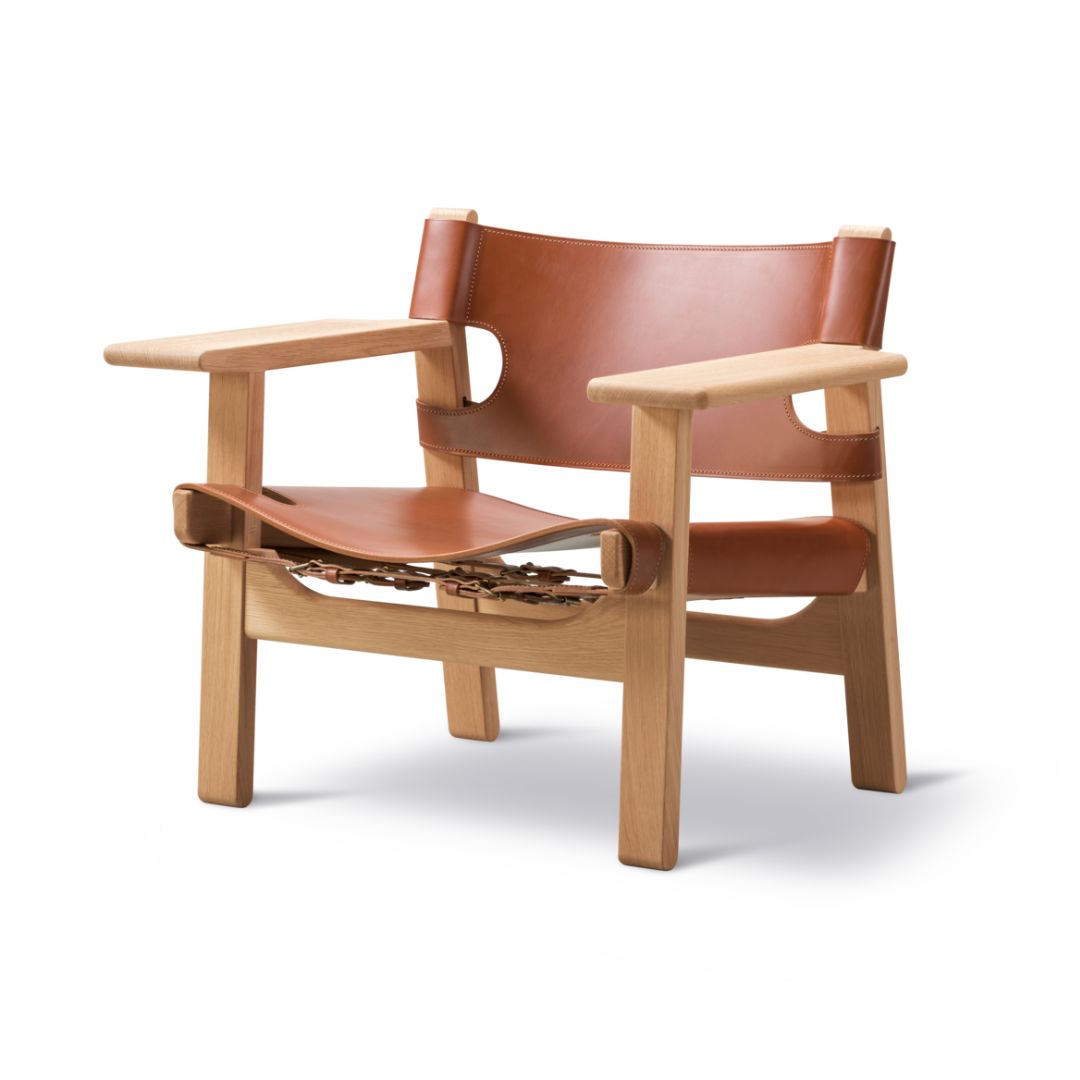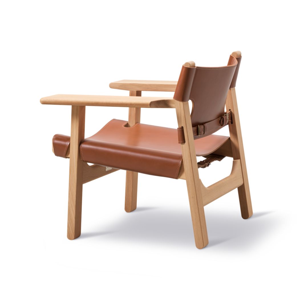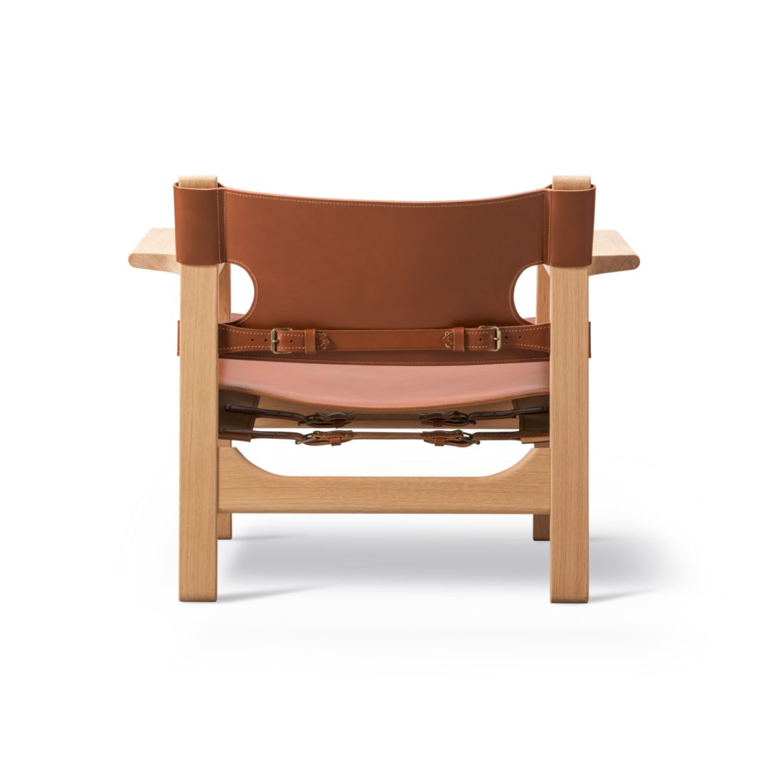 Der spanische Stuhl ist eines der bekanntesten Möbelstücke von Børge Mogensen. Er wurde 1958 entworfen und ist seitdem ein Klassiker in der Fredericia-Kollektion. Der Stuhl ist aus massiver Eiche gefertigt, mit Sitzfläche und Rückenlehne aus Kernleder, die wie bei einem Sattel mit Riemen befestigt sind – eine charakteristische Materialkombination, die mit der Zeit immer schöner wird.