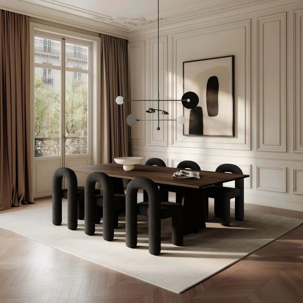 Den subtile adskillelse mellem sæde og ryglæn skaber en næsten svævende effekt, som tilføjer lethed til det skulpturelle udtryk. Den geometriske klarhed giver en raffineret arkitektonisk tilstedeværelse omkring spisebordet, mens den åbne, inviterende form opmuntrer til komfort og socialt samvær under måltider.
