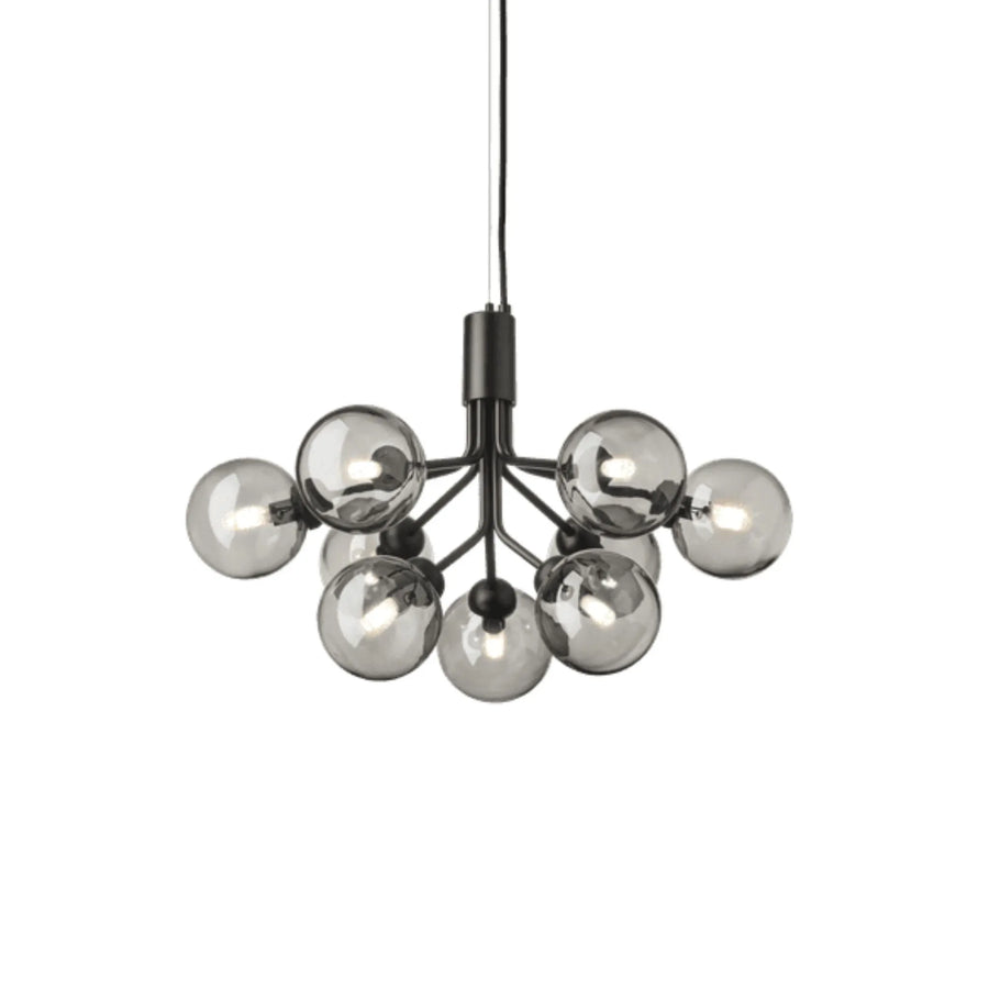Apiales 9 von Nuura ist ein moderner Kronleuchter, der sich hervorragend als stimmungsvolle Beleuchtung im Wohnzimmer oder über einem Esstisch eignet. Die Kollektion ist von der Schirmblume inspiriert, und dieser Nuura-Kronleuchter besteht aus schlanken Metallstielen in satinschwarzem Finish sowie 9 Glaskuppeln aus Rauchglas, die innen mit einem dezenten Muster verziert sind. Die Kombination aus dem schlanken Körper und den eleganten Glasschirmen verleiht der Lampe eine ausgewogene Balance und Schwere, und dank des schwarz-in-schwarz Designausdrucks passt der Kronleuchter in die meisten Wohnungen.