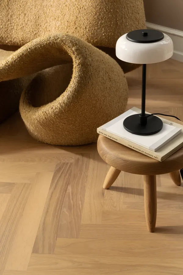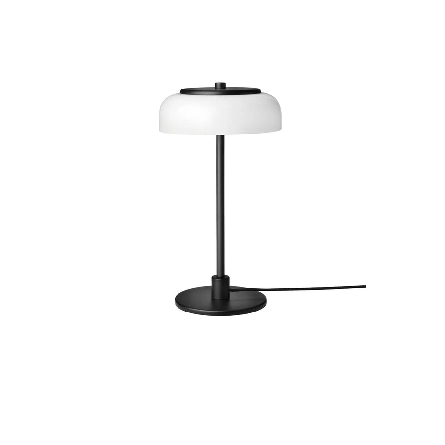 Die Blossi Tischleuchte von Nuura ist eine kleinere Version einer modernen Tischleuchte. Der schlichte opalweiße Glasschirm steht in klarem Kontrast zum schlanken Metallfuß in schwarzer Ausführung und sorgt für einen klassischen und zeitlosen Look. Die Blossi Tischleuchte wird in einer Niedervolt-Version mit einer leicht austauschbaren LED-Karte hergestellt, die ein flimmerfreies Licht bietet und die neuesten EU-Vorschriften für Energieeffizienz bei Beleuchtung erfüllt. Das LED-Modul befindet sich oben am Schirm, wo das Licht nach unten strahlt und auf eine Metallscheibe trifft, die das Licht zurück in den Schirm der Tischleuchte reflektiert und so ein weiches, angenehmes und indirektes Licht für die Leseecke erzeugt. Die Tischleuchte wird mit EU- und UK-Steckern geliefert.