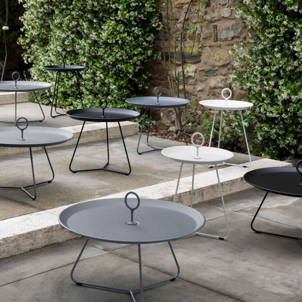 EYELET Tisch von HOUE kann auf viele verschiedene Arten verwendet werden, drinnen ebenso wie draußen, und ist leicht zu bewegen und zu reinigen. Ein spezielles Ablaufsystem hält die Platte frei von Regenwasser.