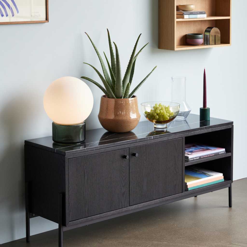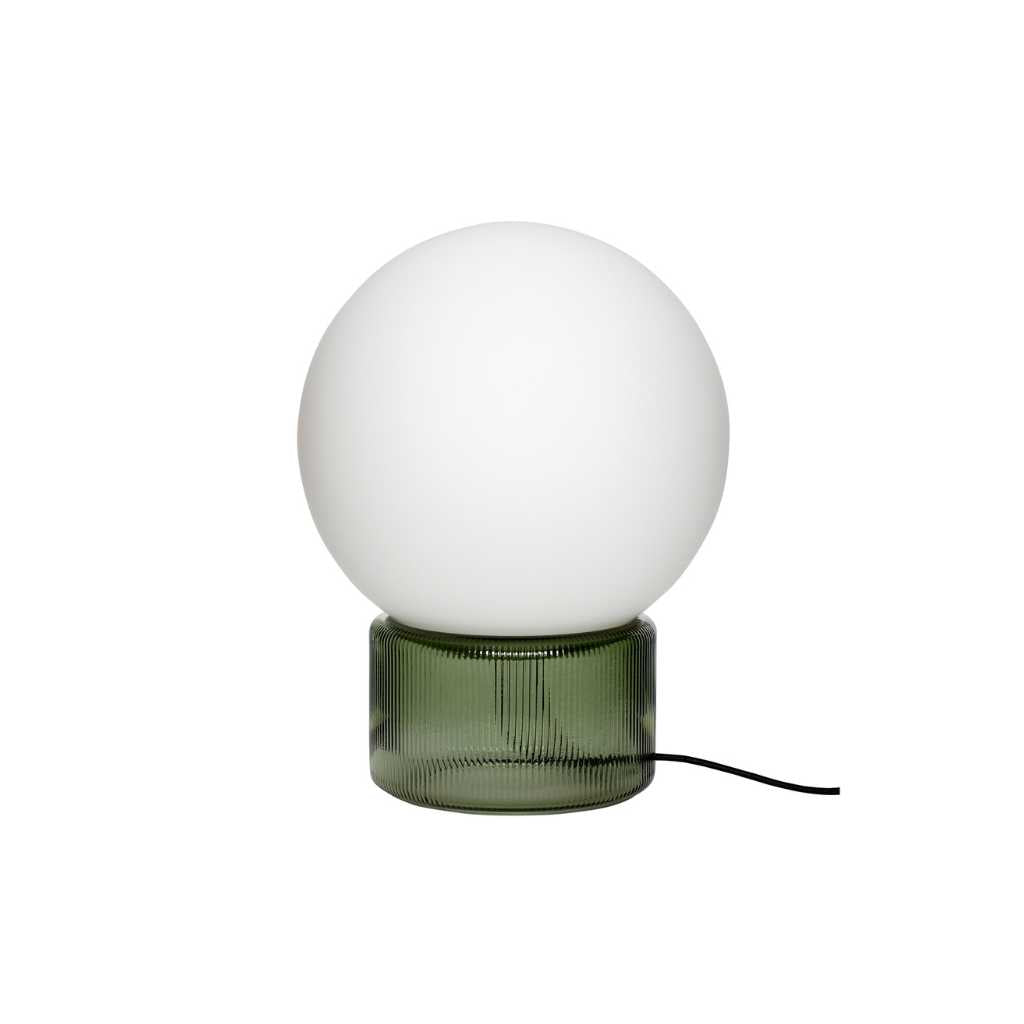 Hübsch Sphere Table Lamp is a green table lamp with a round lampshade and a simple design. It provides soft, pleasant light for the table, bookshelf, or bedside table. The lamp functions as both a light source and a decorative element in the room.