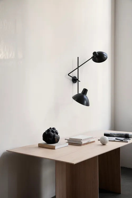 VV Cinquanta features an elegant and versatile adjustable direct light source that can rotate and tilt. The Twin model is an elegant two-armed wall lamp. Mounted on a brass bracket, the two brass arms reach out in opposite directions. The wide signature reflectors can be angled and rotated to provide both indirect and direct lighting simultaneously. A sculptural wall lamp with multiple light compositions. The VV Cinquanta reflector is made of enamelled spun aluminium.