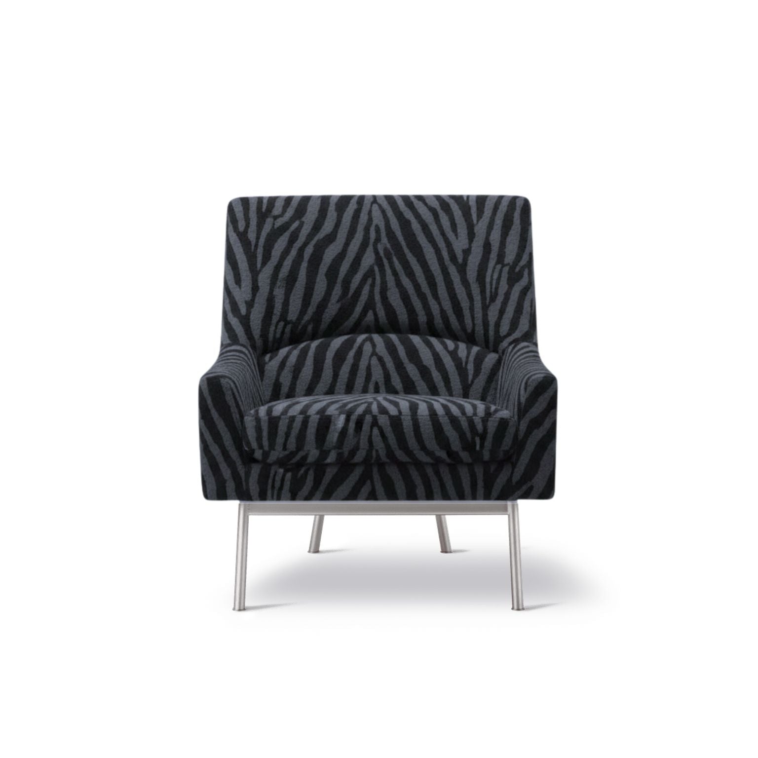 Fully upholstered lounge chair in Tablu 182 from Kvadrat. Fixed legs in chrome. Removable seat cushion with a foam core and down wrap. The seat cushion has a removable cover. The cover on the frame is not removable.